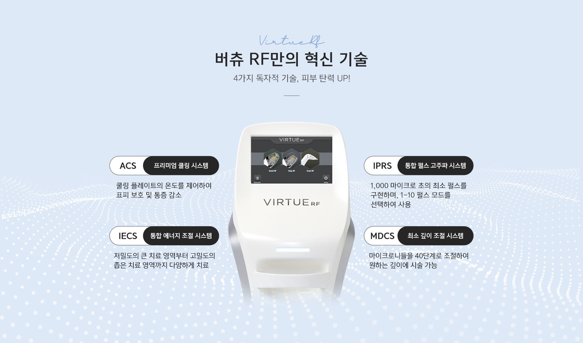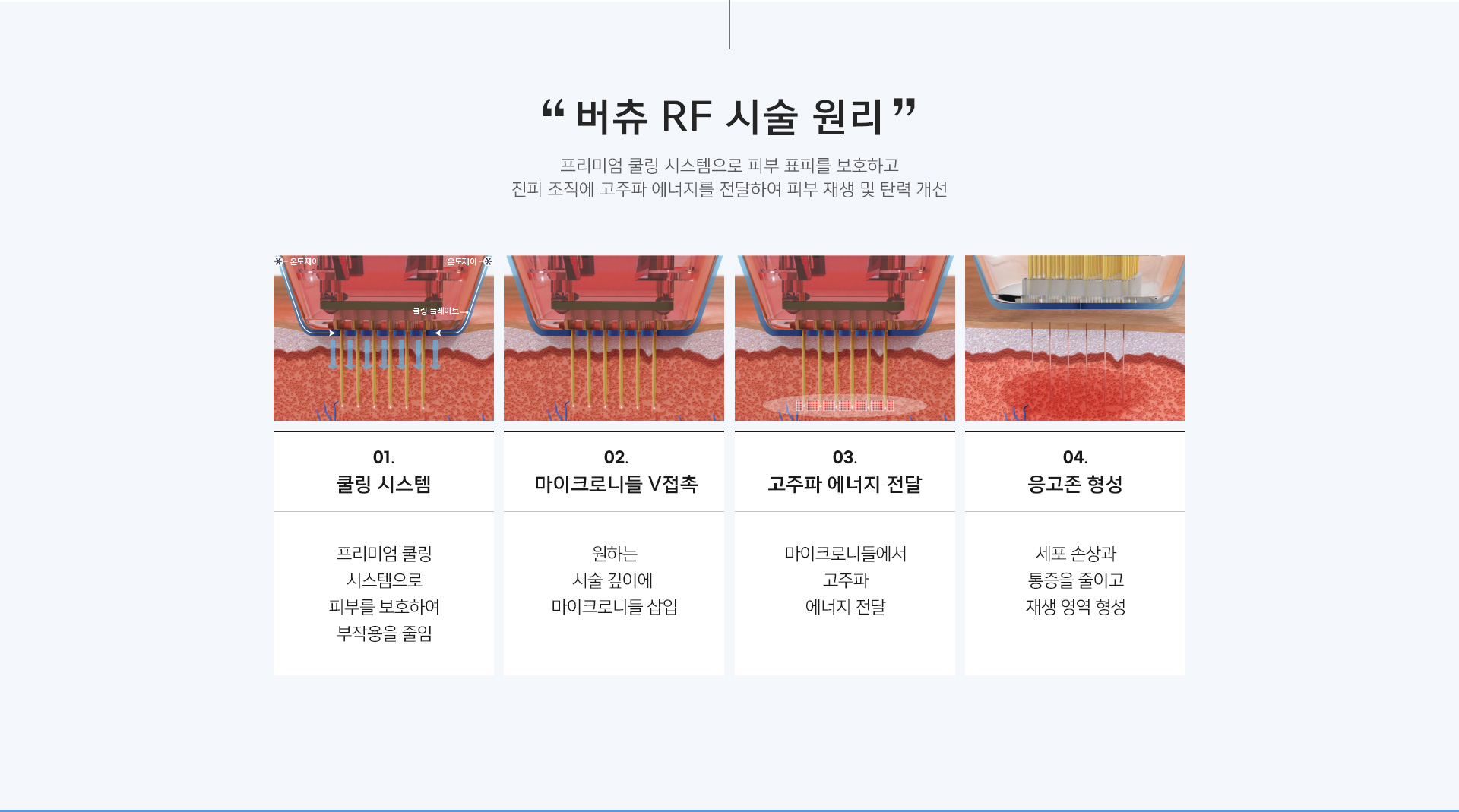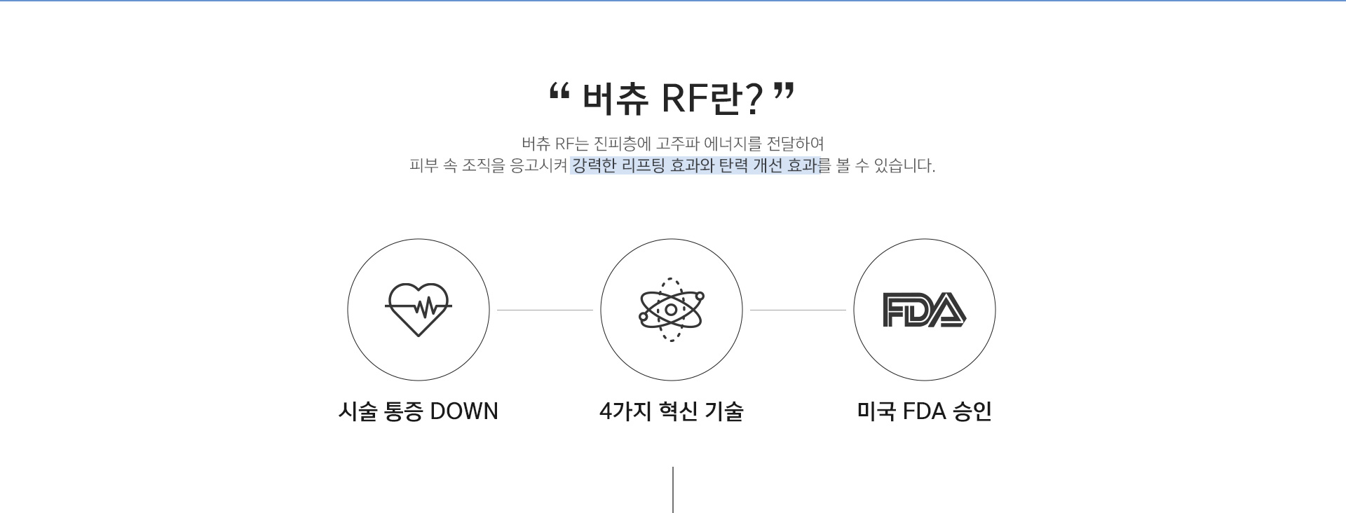 버츄 RF는 마이크로니들과 고주파 에너지를 동시에 활용해 피부 재생과 탄력 개선, 리프팅 효과를 주는 리프팅 시술입니다.